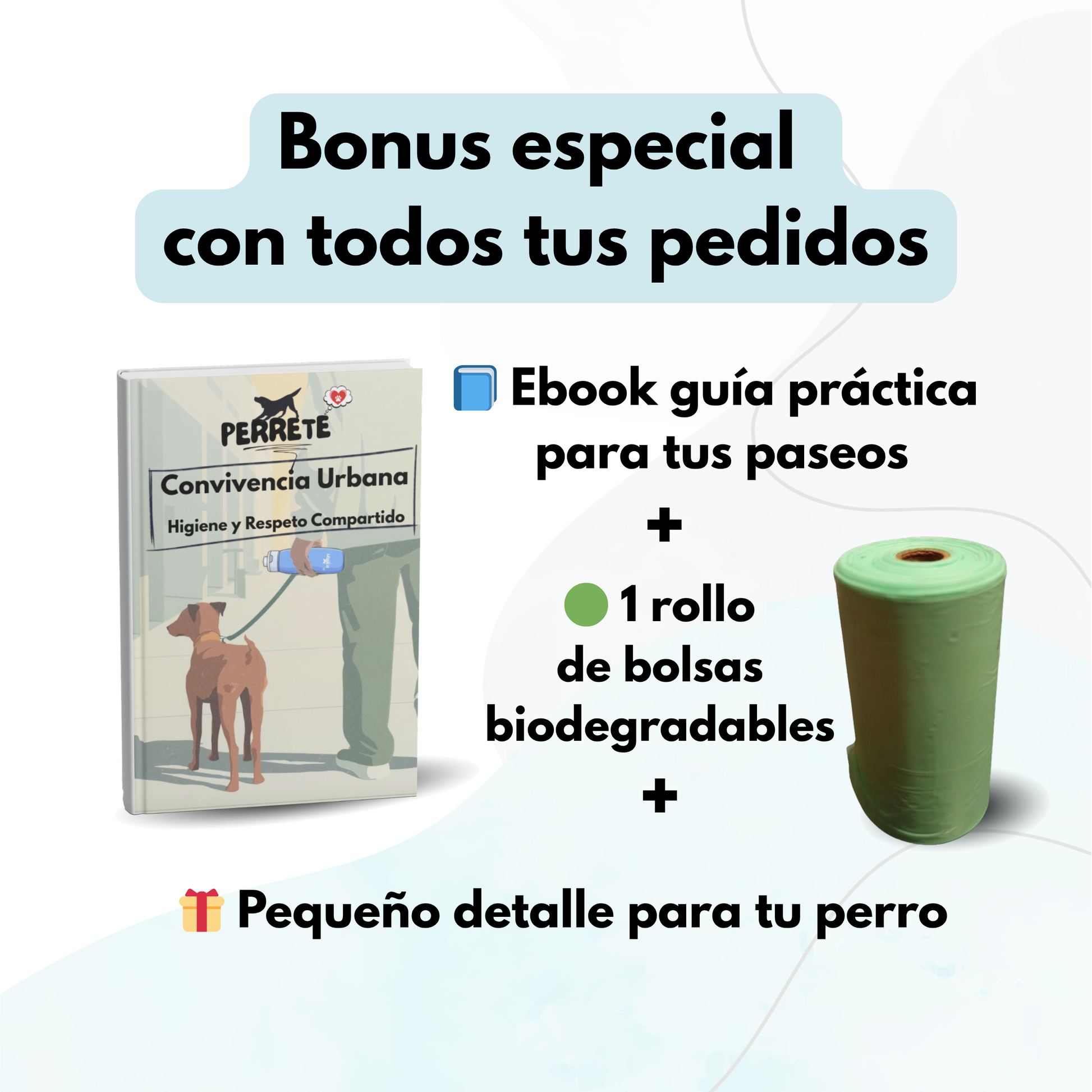- Bonus con tu compra: guía práctica para paseos 📘, 1 rollo de bolsas biodegradables 🟢 y regalo sorpresa 🎁.